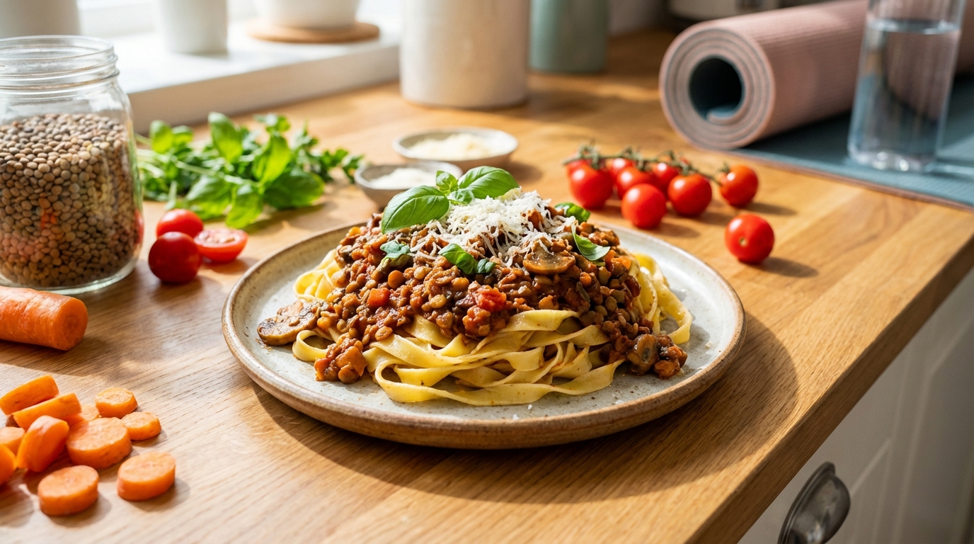 Ces pâtes bolognaise végétales à 30g de protéines par assiette doivent leur texture bluffante à une étape de réhydratation que peu de gens maîtrisent