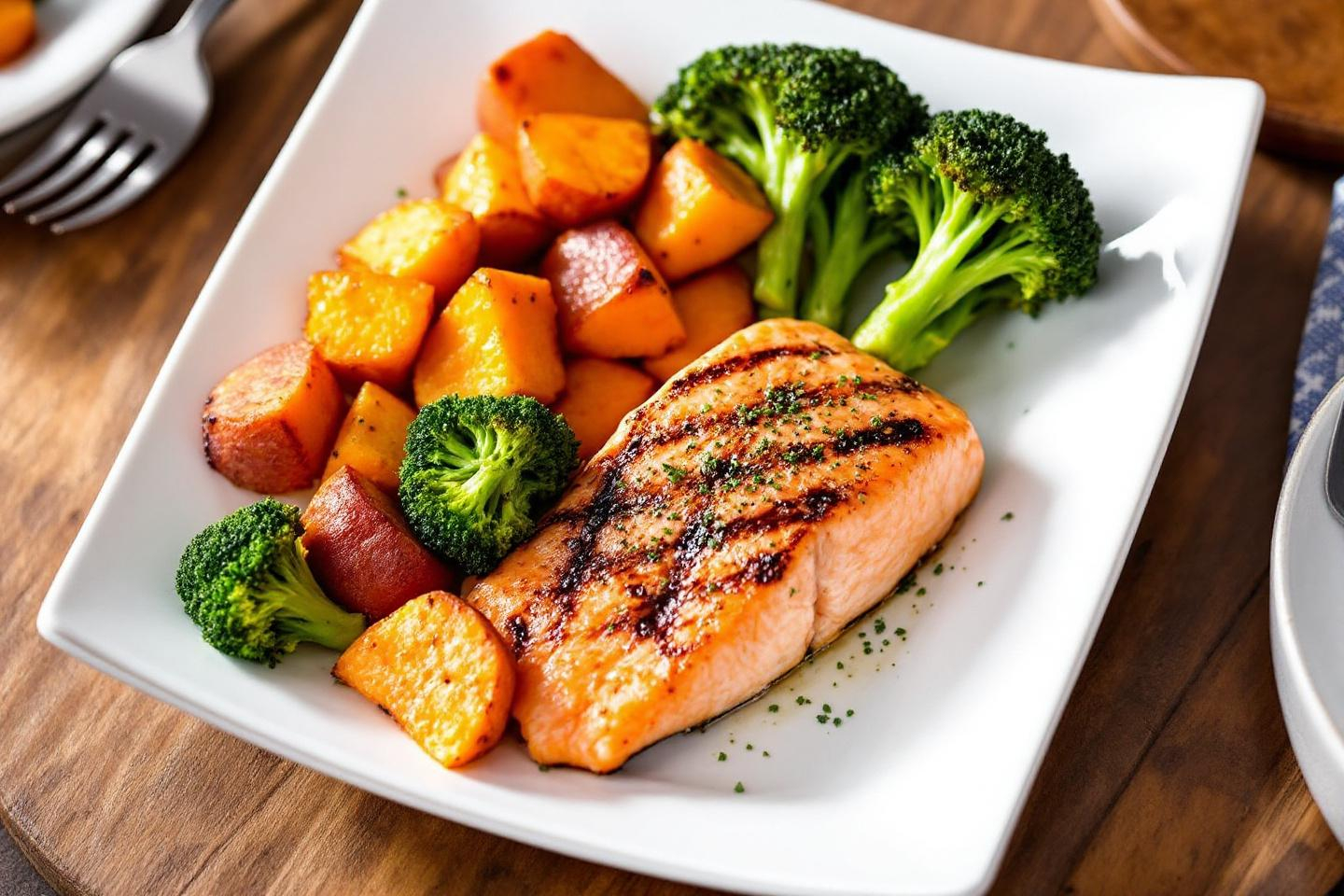 Le repas minceur du jour : pavé de saumon, patates douces et brocolis