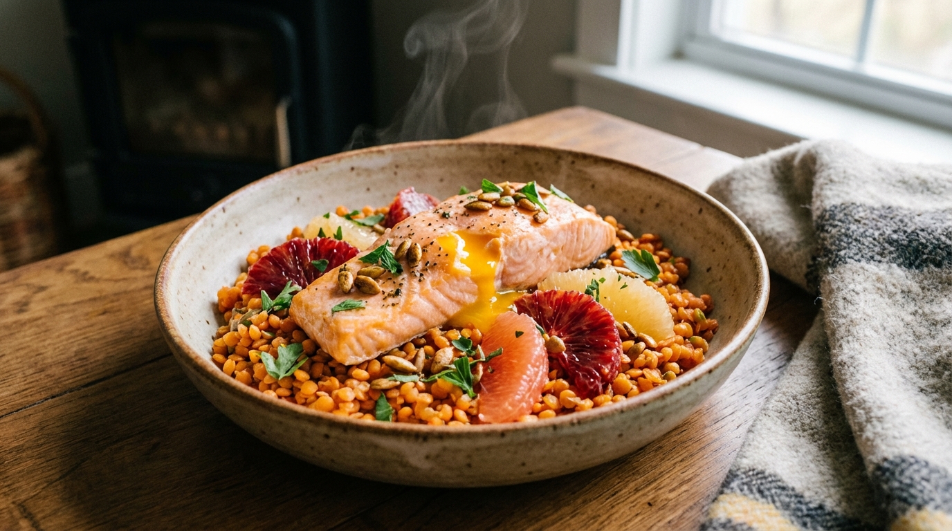 Ma salade tiède de lentilles corail et saumon poché doit son efficacité anti-fatigue à ce duo de fruits que je ne néglige jamais
