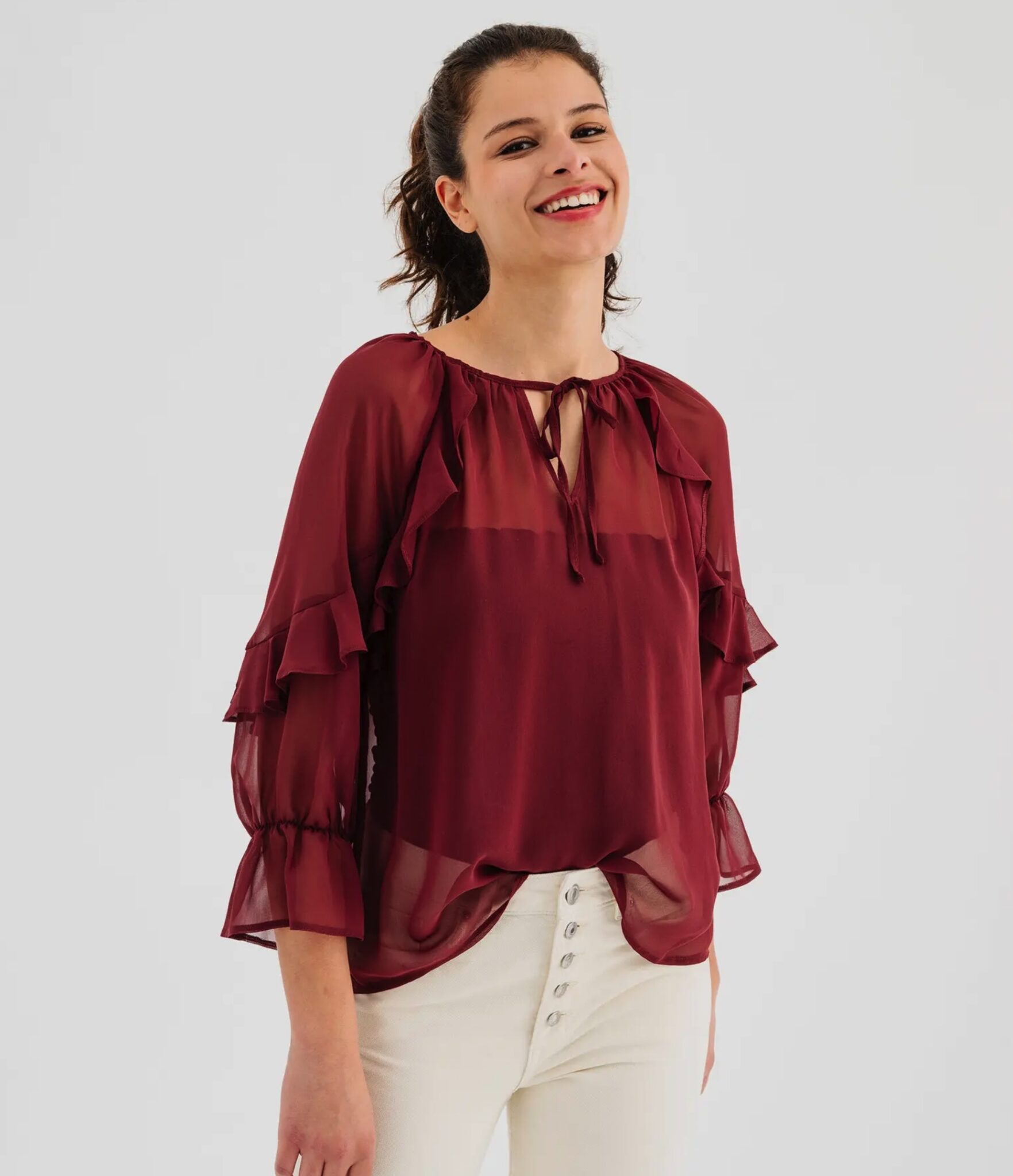 La blouse bordeaux à volants fait le show pour l’hiver : à 13 € chez Gémo pendant les soldes, le bon plan chic à ne pas louper