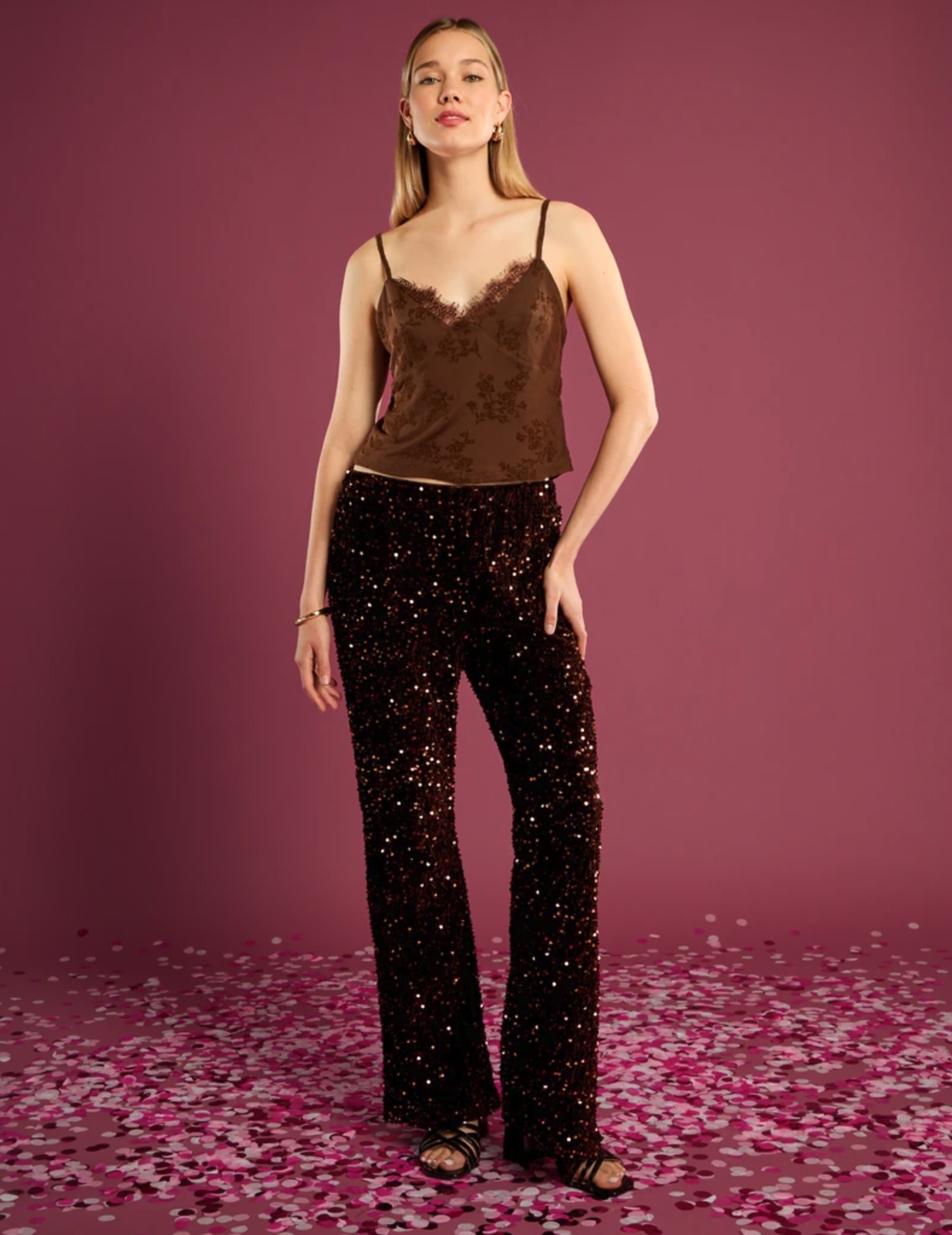 Le pantalon flare à sequins marron qu’on va toutes vouloir pour les fêtes est à 25 € chez Kiabi cette semaine