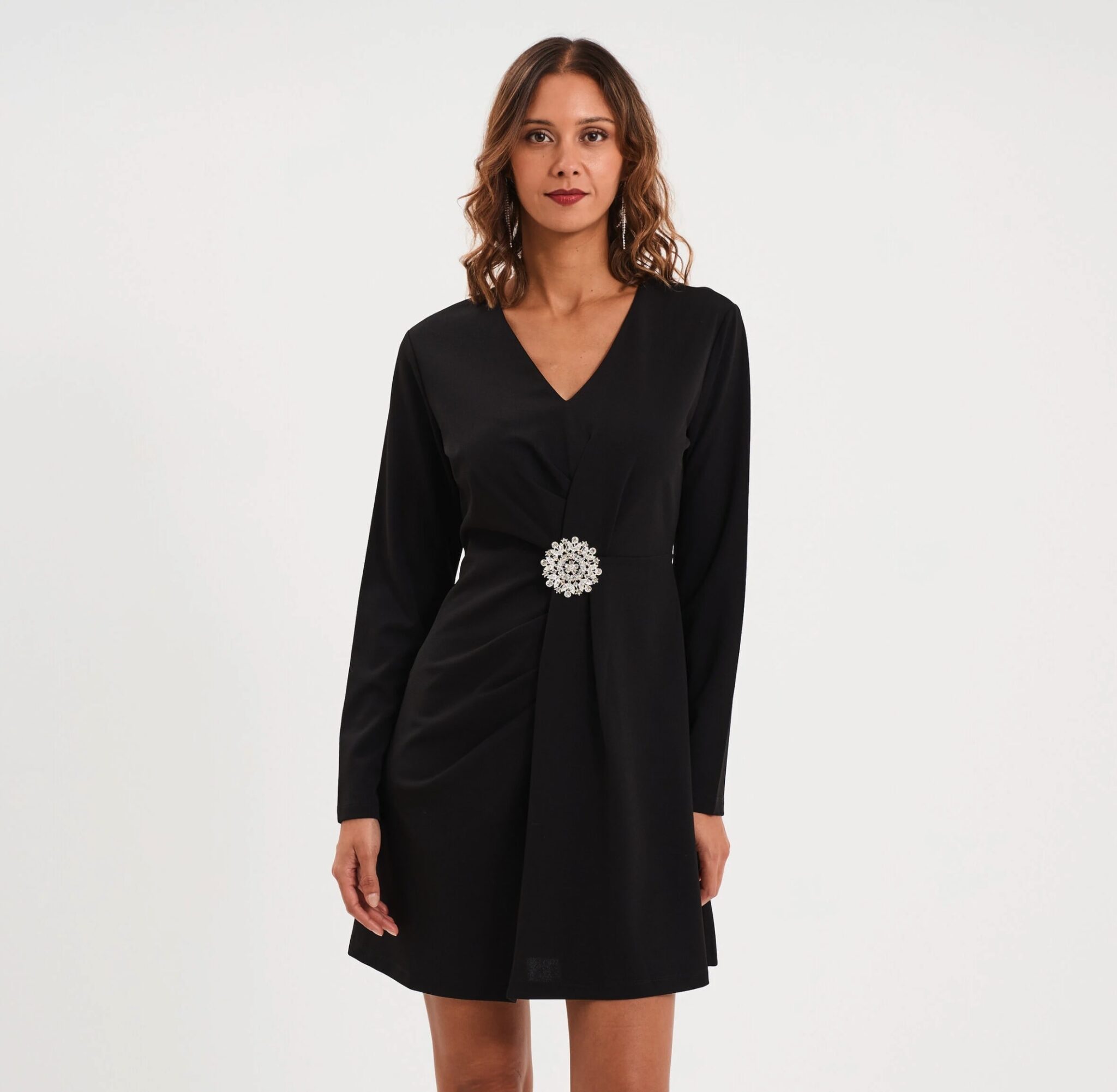 La robe noire drapée chic à détail broche s’invite à 35 € chez La Halle cette semaine, dispo en boutique et en ligne