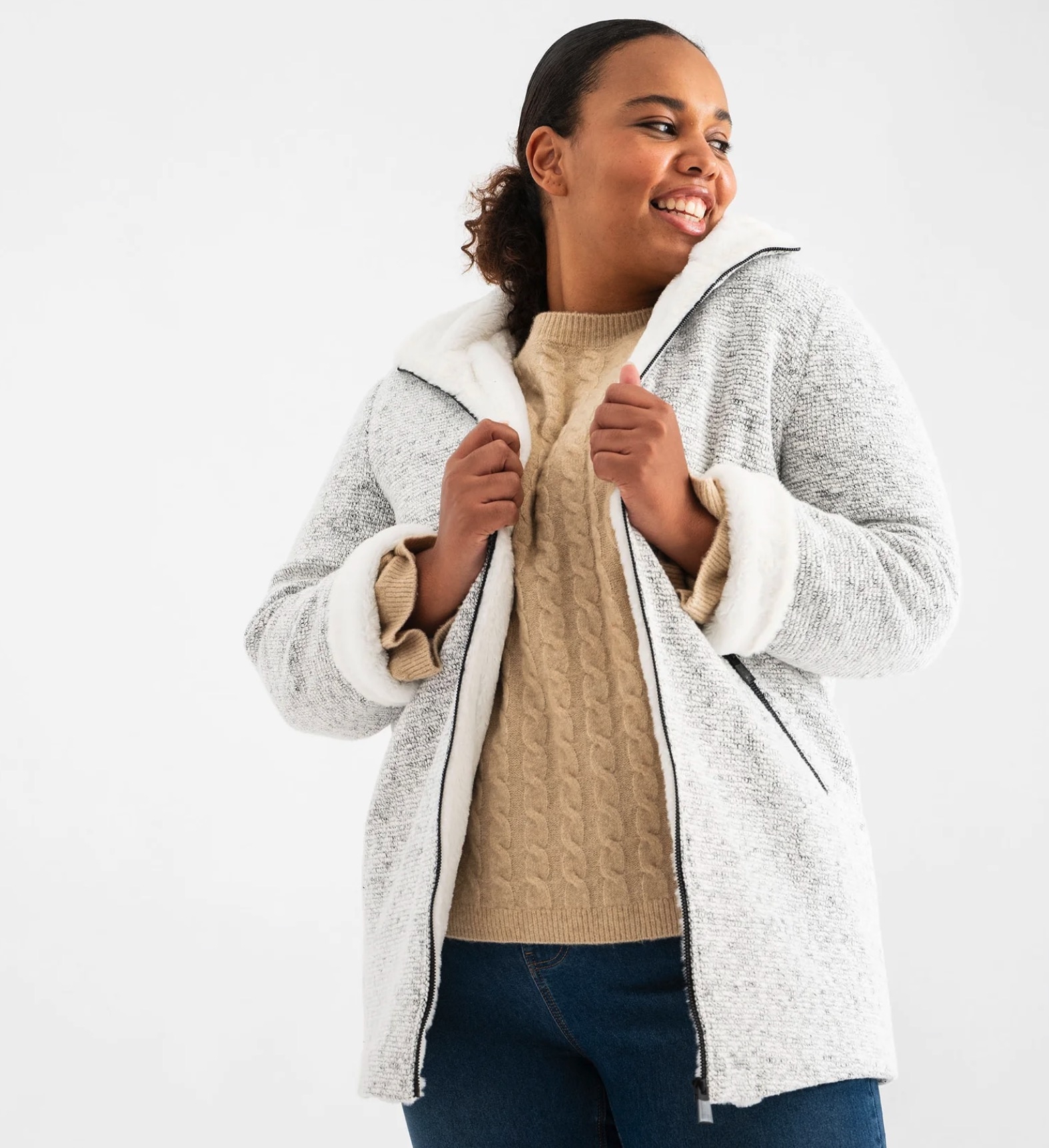 La maille bouclette fait son retour : le manteau grande taille à capuche doublé peluche repéré à 69 € chez Gémo