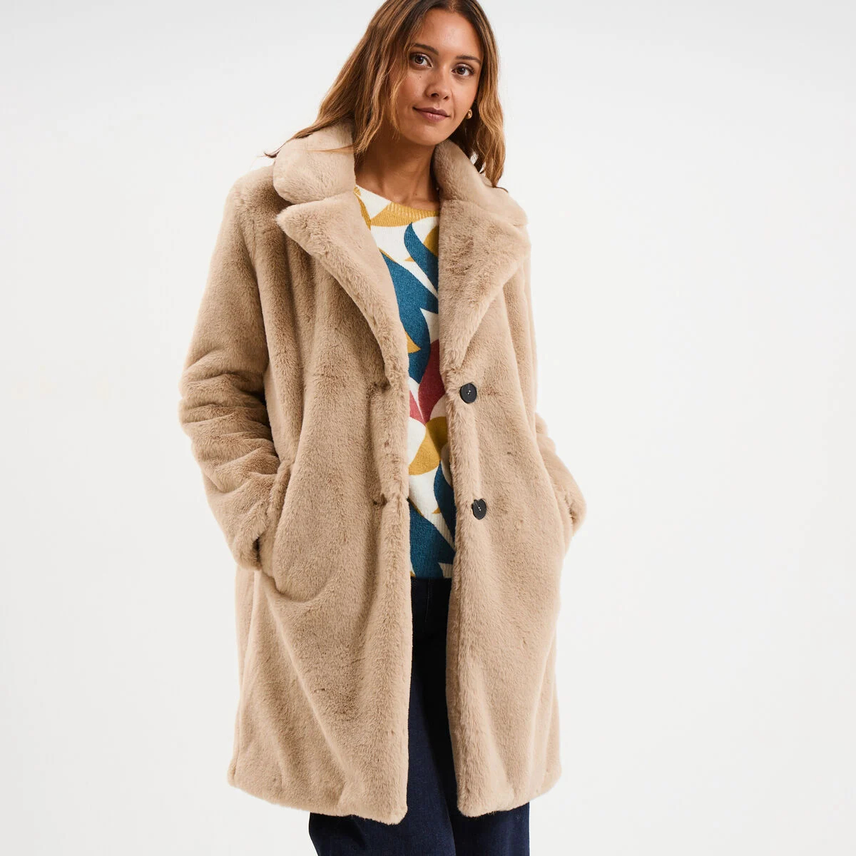 Le manteau long fausse fourrure beige femme star de la saison s’affiche à 41,99 € chez La Halle cette semaine
