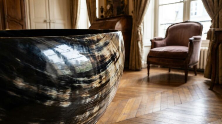 Pourquoi cet engouement pour la corne noire marbrée ? Contrairement à la pierre, froide au toucher et visuellement rigide, la corne possède une vibration unique. Elle capture la lumière d’une manière subtile, offrant des reflets changeants selon l’heure de la journée. Les nuances vont du noir profond à l’ambre translucide, créant un tableau vivant et unique pour chaque pièce.
