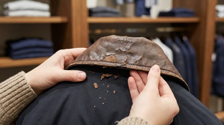 Le diable se cache dans les détails, particulièrement pour les finitions. Les cols, les liserés de poches ou les coudières sont des zones soumises à une contrainte mécanique forte et constante. Le frottement contre le cou, l’acidité naturelle de la peau ou simplement le mouvement des bras créent des micro-fissures dans l’enduction plastique. Très vite, l’aspect lisse laisse place à un tissu qui pèle, révélant la trame textile disgracieuse en dessous. C’est souvent irréparable, transformant votre vêtement fétiche en tenue inadéquate.