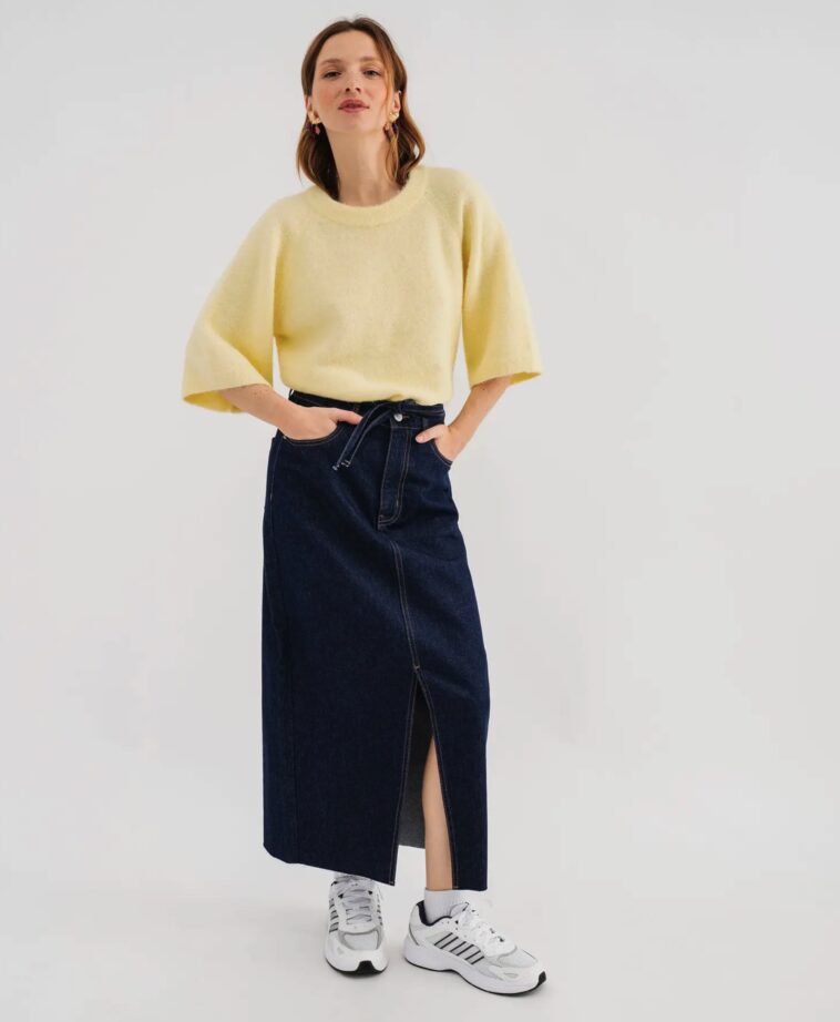 En ce moment, le pantalon laisse volontiers sa place à des coupes plus libératrices. La jupe longue en jean revisite les codes classiques pour offrir une dégaine résolument moderne. Avec ses 84 cm de longueur et son bas à bords francs, elle garantit un look casual et authentique incomparable.