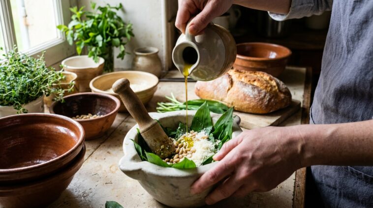 Assembler cette sauce divine demande un brin de méthodologie. On commence par hacher grossièrement la verdure pour faciliter le travail. Peu à peu, on adjoint les pignons de pin, puis le parmesan. À ce stade, la patience est de mise pour obtenir une pâte homogène et parfumée.