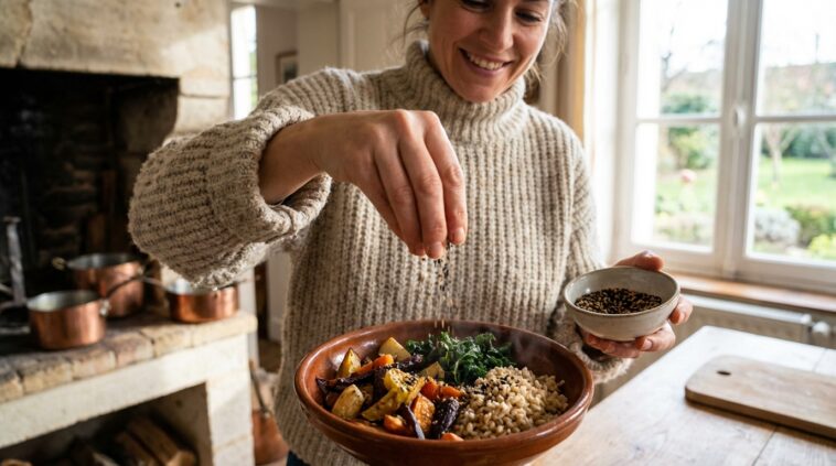 Cependant, une règle d’or s’impose : ne jamais cuire le gomasio. La chaleur de la cuisson détruirait les acides gras essentiels et les vitamines préservés lors de la torréfaction douce. Il s’utilise exclusivement en assaisonnement final, saupoudré directement dans l’assiette. Il fait des merveilles sur un bol de riz complet fumant, réveille une soupe de légumes racines, sublime une simple salade de mâche ou apporte du croquant à des légumes vapeur. En adoptant ce rituel simple à chaque repas, l’organisme commence à se reminéraliser progressivement, et la différence se fait sentir sur le niveau d’énergie global au fil des semaines.