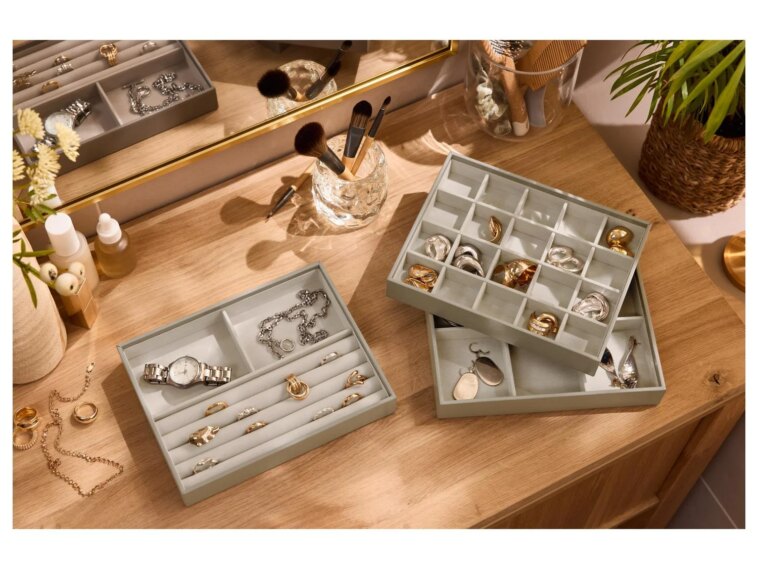 Réservez un plateau aux bijoux “tous les jours”, un autre aux pièces de sortie, et gardez un espace dédié aux bijoux précieux. Ça évite de tout manipuler à chaque fois, et on garde l’essentiel à portée de main.
