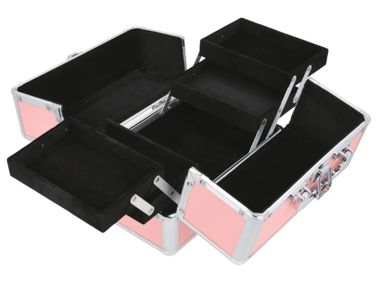Le point fort, c’est l’intérieur pensé pour le rangement. On retrouve un grand compartiment principal et des compartiments escamotables des deux côtés, pratiques pour adapter l’espace selon ce que vous avez : palettes, rouges à lèvres, vernis, crayons.