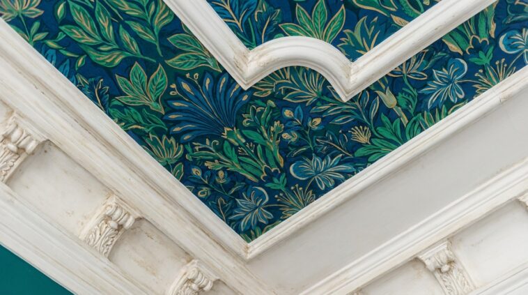 Pour les plus audacieux, c’est le moment d’oser les motifs panoramiques ou floraux XXL. Dans une entrée, un couloir ou même des toilettes, un plafond orné de grands motifs végétaux ou géométriques crée un effet remarquable. Cela permet de garder les murs neutres et unis, tout en apportant cette touche de fantaisie qui manque souvent à nos intérieurs. L’astuce est de considérer le plafond comme une toile de fond artistique. Attention toutefois à l’équilibre : si le plafond est chargé, le reste de la décoration doit respirer pour ne pas surcharger le regard et respecter une harmonie visuelle apaisante.
