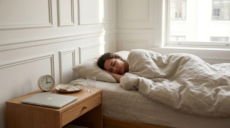 - 3 heures avant le coucher : Arrêter complètement de manger. La digestion demande une énergie considérable et augmente mécaniquement la température de votre corps, ce qui fragmente violemment le sommeil paradoxal.