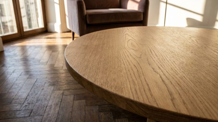 - Laissez circuler l’énergie : Sa forme ronde fluidifie la circulation, surtout dans les petits espaces. Ne la collez pas trop au canapé ; laissez environ 40 à 50 cm d’espace pour que vos jambes soient à l’aise.