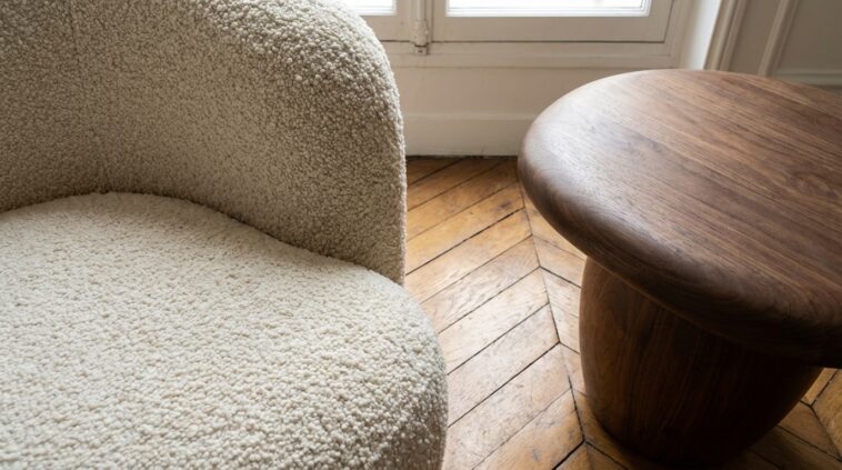 Zoom sur les matériaux stars de la gamme : on assiste au véritable triomphe du chêne massif et du placage noyer. Loin des imitations plastiques qui brillent trop, ces bois affichent leurs veines et leurs imperfections naturelles. Ils sont accompagnés de textures tactiles qui invitent au toucher, comme des tissus bouclés ou des cotons texturés. Ce retour à la matière brute est essentiel : dans un monde de plus en plus numérique, nous avons besoin de sentir la rugosité d’une céramique ou la chaleur du bois véritable.