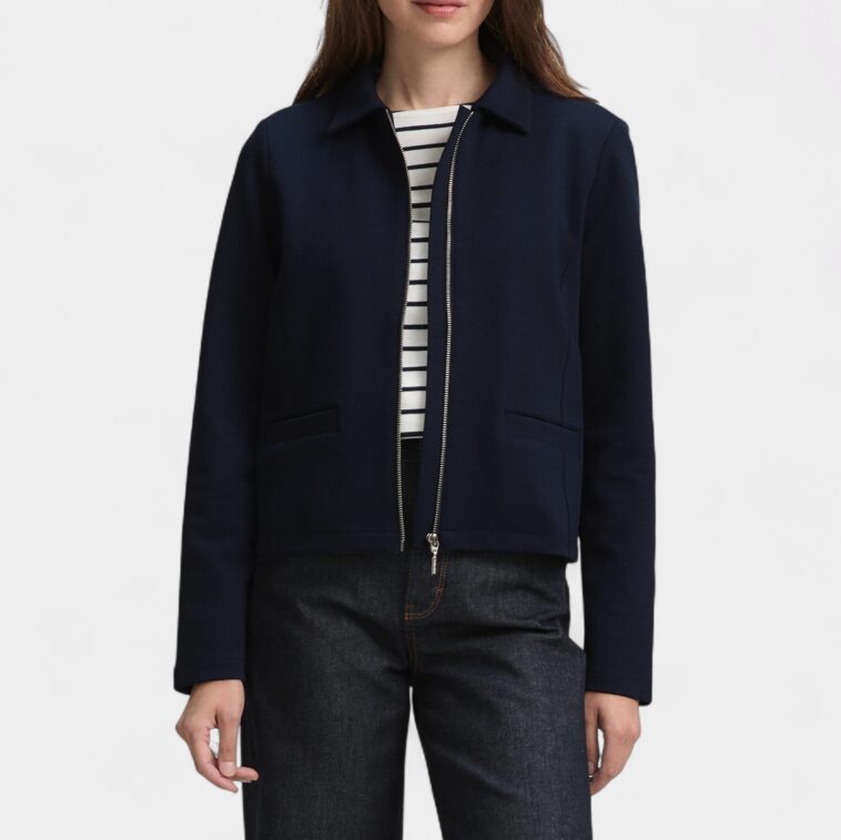 L’avantage majeur de cette veste bleu marine réside dans sa polyvalence. Pour un look de tous les jours stylé et décontracté, elle forme l’alliance parfaite avec un jean denim brut et une paire de baskets blanches ou de mocassins. L’ensemble est cohérent, efficace et indémodable. C’est l’uniforme idéal pour arpenter la ville avec style sans sacrifier son confort.
