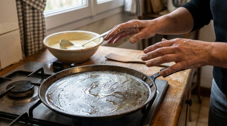 La légende familiale dit souvent que tout dépend de la pâte : farine tamisée, œufs à température ambiante, lait versé en filet, repos “au moins une heure”. C’est vrai… mais seulement jusqu’à un certain point. Une pâte bien lisse et reposée offre de l’élasticité, limite les grumeaux et aide à obtenir des crêpes souples. Pourtant, même la plus belle pâte du monde ne peut pas compenser une poêle qui n’est pas dans les bonnes conditions au moment crucial.