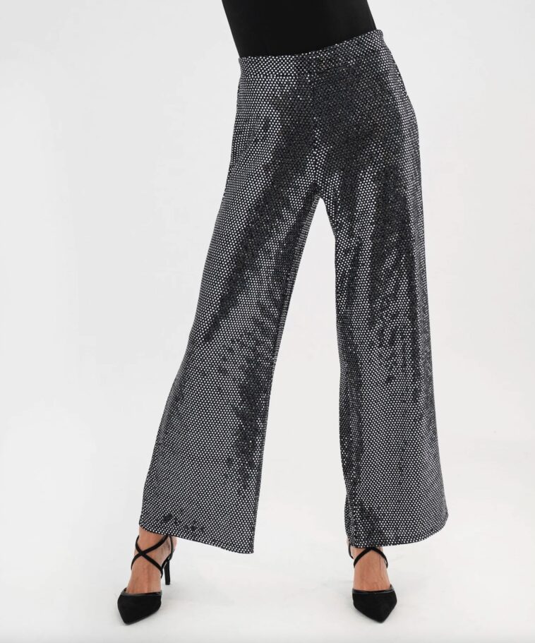 Impossible d’oublier le pouvoir des paillettes pour magnifier la moindre silhouette. Avec son fini façon boule à facettes, ce pantalon capte la lumière et donne un côté chic instantané, sans aucun effort. Peu importe que la soirée soit à la maison ou dans un club, ce détail scintillant apporte la touche de glamour qu’on recherche toutes durant la période des fêtes.