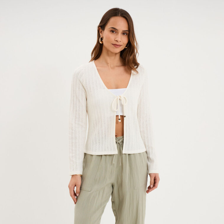 Comme Vénus qui réapparaît dans notre ciel nocturne, l’effet ajouré fait un retour spectaculaire au printemps. Cette texture singulière apporte immédiatement une touche bohème à n’importe quelle tenue de tous les jours. Grâce à ses motifs délicats qui laissent subtilement deviner la peau, ce vêtement ne se contente pas d’habiller, il dégage une véritable aura romantique. C’est l’atout charme par excellence pour flâner sous le soleil timide de la mi-saison tout en affirmant une allure douce et poétique.