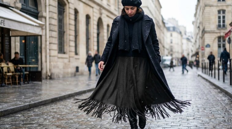 Pourquoi cet engouement soudain, en plein cœur de l’hiver ? L’argument est avant tout visuel. Nos tenues hivernales sont souvent statiques, enfermées dans des coupes droites et des matières inertes. La jupe à franges introduit du dynamisme et de la vie. Elle capture le moindre coup de vent, la moindre accélération, transformant un simple trajet vers le métro en moment de grâce.