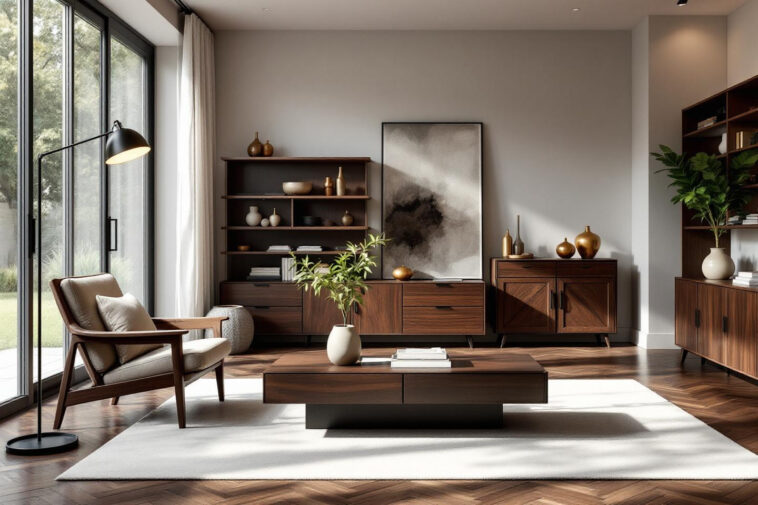 L’une des craintes fréquentes avec le bois foncé ? Trop en mettre et se retrouver avec un intérieur étouffant. Astuce : privilégier une pièce maîtresse (bibliothèque, buffet, table) et contrebalancer avec des éléments plus clairs autour (murs, rideaux, tapis). Par exemple, un beau meuble télévision en bois sombre suffit largement à structurer l’espace sans assombrir la pièce. En juillet-août, il suffit parfois d’alterner quelques accessoires foncés (ramequins, plateaux, bougeoirs…) pour insuffler un nouveau rythme à la déco.