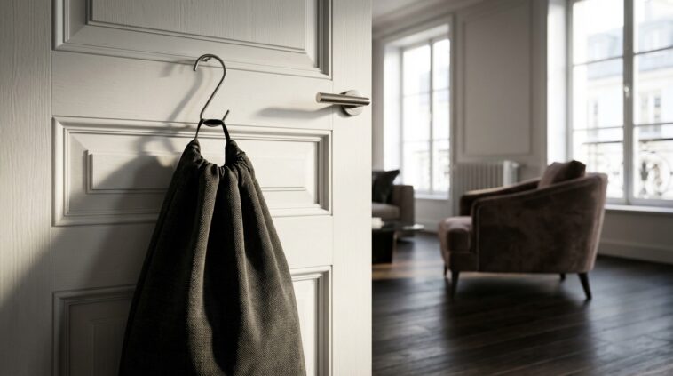 Avec cette approche suspendue, chaque membre de la maison peut facilement glisser ses affaires dans le sac dissimulé derrière la porte. Plus rien ne traîne sur le sol du couloir ou de la salle de bains. L’espace reste dégagé à tout moment, facilitant d’ailleurs grandement le passage de l’aspirateur ou de la serpillière en cette période de nettoyage régulier.