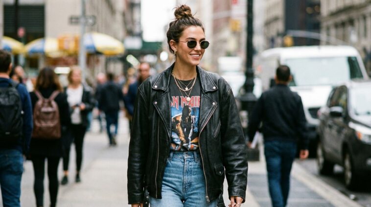 Cette combinaison confère une allure très moderne et ancrée dans le streetwear chic. Elle permet de simplifier la bottine, parfois jugée sophistiquée, en lui apportant une touche décontractée, tout en rehaussant le jean très large d’une note sophistiquée. Au final, c’est l’option idéale pour parcourir la ville au printemps : une silhouette confortable, une chaussure structurée et un cuir travaillé qui marquent le pas avec style.