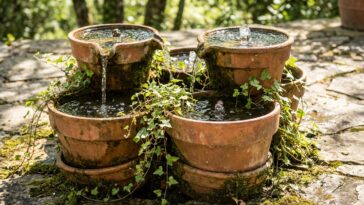 La mise en place prend rapidement forme, de manière quasi intuitive. Démarrez en stabilisant le grand bac récupérateur sur le sol, puis déposez-y le plus gros des pots en terre cuite. Le secret de conception réside dans le trou de drainage naturel, déjà présent au fond des contenants. Il sert de passage idéal pour faufiler délicatement le tuyau souple vers le haut. Il suffit ensuite d’empiler les pots restants de manière asymétrique, du plus grand au plus petit, pour créer les différents paliers qui feront chanter l’eau de la future fontaine.