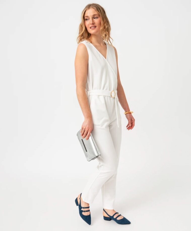 La vedette de la saison ? Une combinaison pantalon femme au coloris blanc chiné, idéale pour la transition vers le printemps. Son atout principal réside dans sa conception réfléchie : un haut cache-cœur qui met subtilement le décolleté en valeur, associé à un pantalon coupe carotte qui affine la jambe. Sa matière extensible à l’aspect crêpe assure une élégance sans compromis sur le confort. Grâce à une taille élastique et à une ceinture amovible ton sur ton à boucle métallique, elle s’adapte à toutes les morphologies, du XS au XL, soulignant ainsi chaque silhouette.